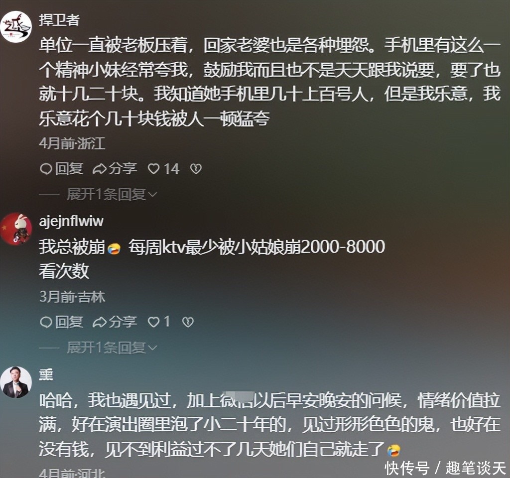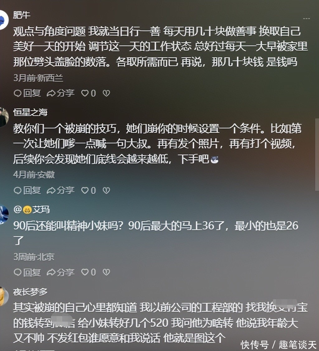 还有网友说:被两个小女孩崩过。观点与角度问题,我就当日行一善,第一次请她们俩,这俩跟没吃过饭一样,点了一桌子,结果结账发现才65块,边吃还边嗲嗲的喊自己哥。每天用几十块做善事,换取自己美好一天的开始,调节这一天的工作状态,总好过每天一大早被家里那位劈头盖脸的数落。各取所需而已!再说,那几十块钱,是钱吗?
