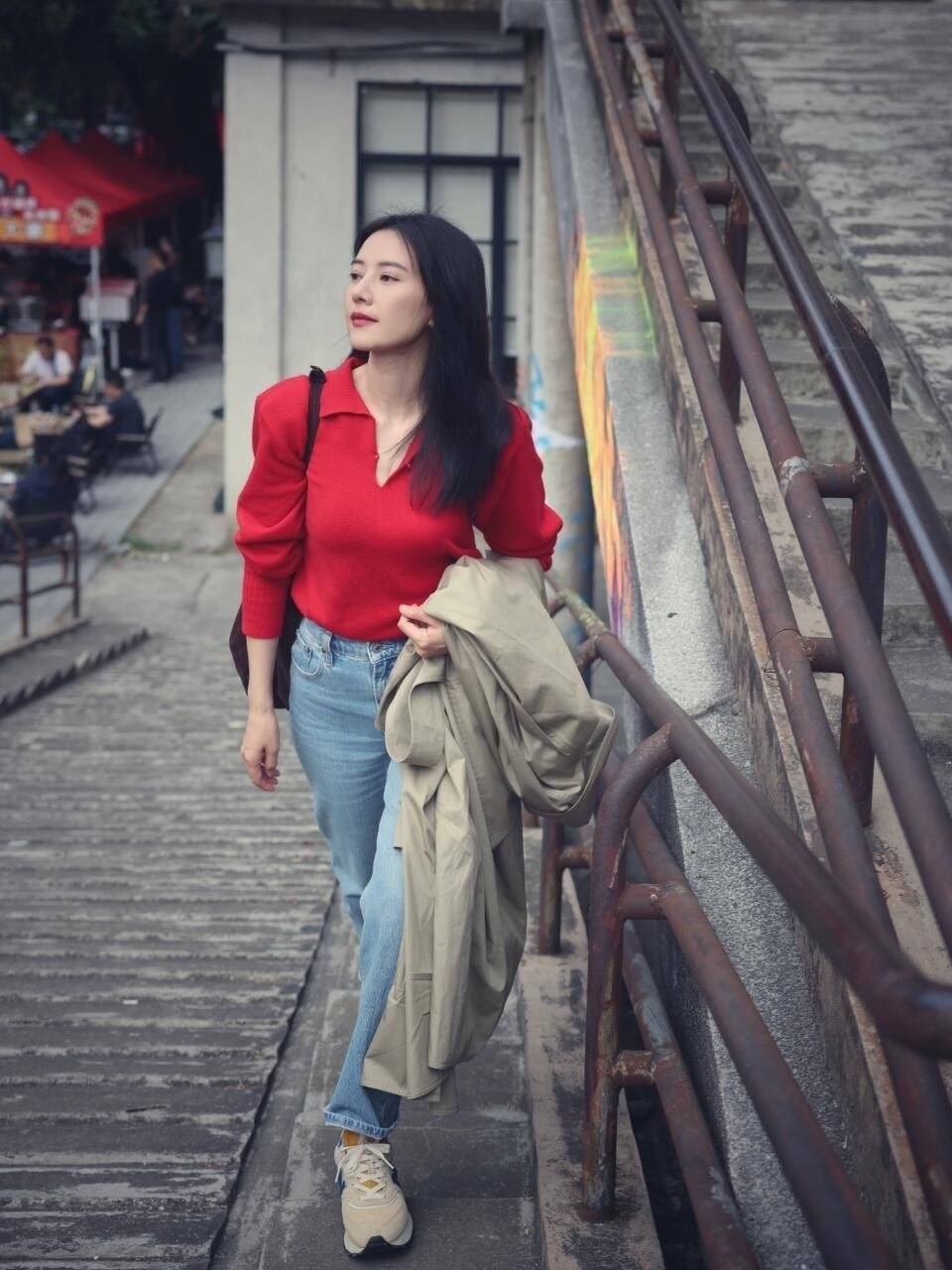 秋天必备的风衣搭浅蓝色牛仔裤也不错,视觉上养眼又时髦。上半身内搭选了一款大红色打底衫,仅看一眼便能注意到。腿上所穿牛仔裤不是大松量,对修饰腿部线条很有帮助。