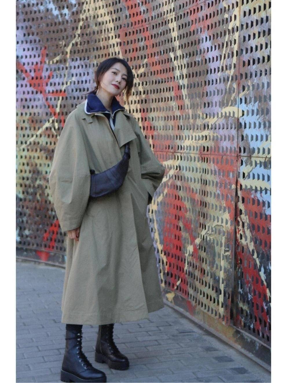 身上这件风衣版型比较宽松,正是因为如此,小个子女生不太容易驾驭。比如,袖子松量多,虽然袖口有收紧趋向,但很容易显得手臂粗且短;其他部分松量多的话会容易压身高,这对小个子女生来说都不是优势,因此,娇小女生在挑风衣时,一方面要选对衣长,另一方面风衣松量也十分重要,以免在衣柜里落灰,钱白花了。